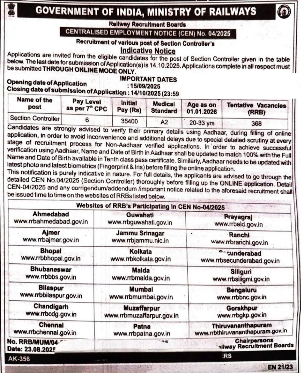 Railway Recruitment Board (RRB)has released a short notice on official website for the recruitment of Section Controller Post. This recruitment is for 368 positionsRRB Application Form will start from 15 September 2025 & the candidates can apply till the 14 October 2025. The Minimum age required is 20 Years & The Maximum Age Is 33 Years as on 01 January 2025. Candidates must check the complete details for RRB Section Controller Recruitment 2025 which has given below.